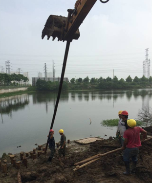 从2015年6月1日景观单位进场至今,龙湖湾小区临湖景观初期的堆土整平与放线已经大部完成。自6月21日起,沿湖驳岸的护桩正式施工,施工单位在进行水草清除及岸边土方整形后,正式开始打桩,截止目前已经打了110根水杉木桩。